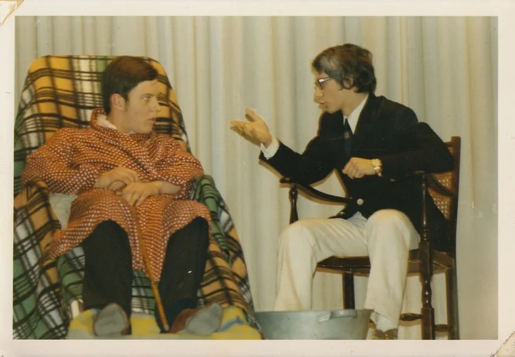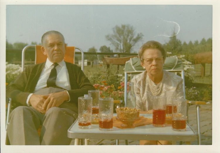 He wears a brown cardigan and has yellow fingernails, holding the incense of cigarette